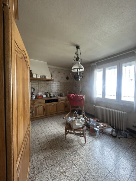 • Belle cuisine aménagée, carrelée avec meubles hauts et bas, évier, plaque de cuisson au gaz de 15,35