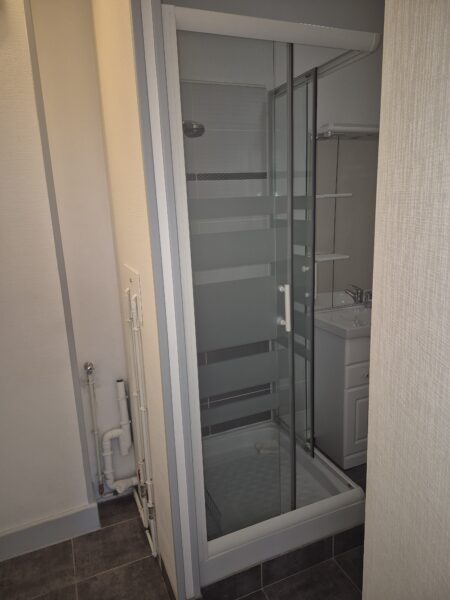- Salle d’eau : moderne et fonctionnelle, d’une superficie de 4,8 m², comprenant une douche, une vasque avec miroir et un WC, le tout sur un sol en carrelage.