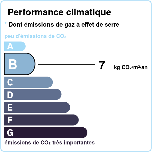 • GES - Performance climatique | Lettre du classement + Valeur Kg CO₂/m²/an: B - 7kg CO2/m2/an